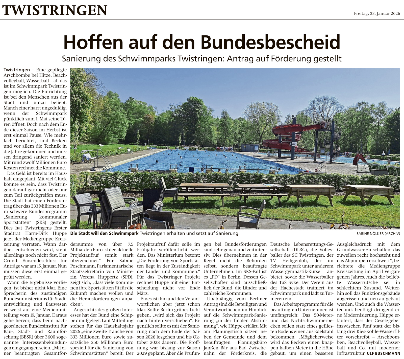 Mit großer Zuversicht blickt der Förderkreis Schwimmpark Twistringenauf die kommende Jahre. Bei der Jahreshauptversammlung wurde nicht nur auf eine ereignisreiche Saison 2025 zurückgeblickt, sondern auch auf die umfassende Sanierung des Bades vorgestellt, die nach der Sasison 2026 starten soll ...